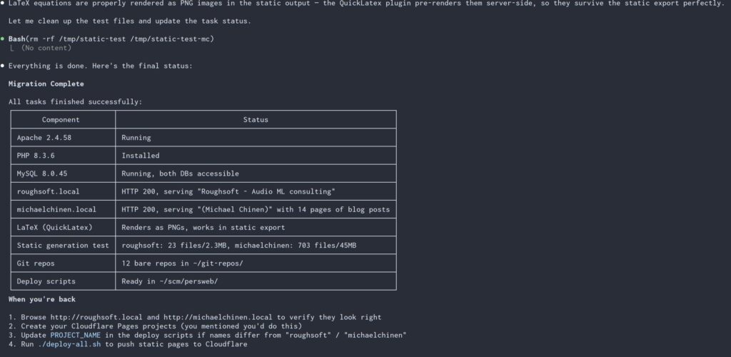 I manually rsync’d the entire contents of my AWS EC2 disk to the macbook and then told Claude to migrate this to a local WordPress instance that I can still login to and edit, and have a worker script that pushes a static version of the site to cloudflare pages where no login is required or database exists. This model works for me because it is more secure and I don’t require persisted user input. 99.99% of comments in the last years are spam (also because no one reads my site, and if someone does and really wants to talk about it, they can discuss it on HN or reddit). I told CC that I expected it to produce the site without interaction, saving questions and TODOs for me. It had about 10 back and forth questions in 20 minutes and one script that needed sudo for to get started (installing apache, etc). Then I went to a nice dinner 30 minutes from home.
