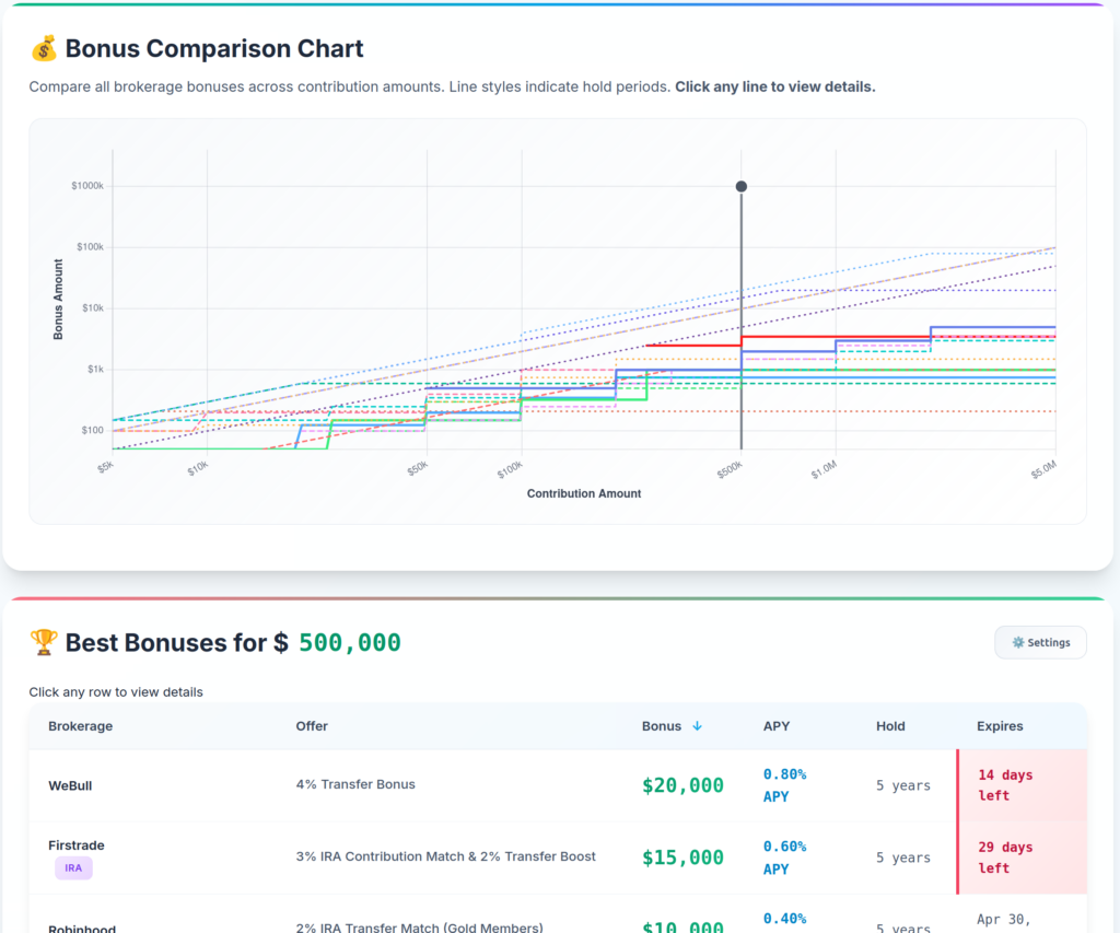 I did 4 sessions of Claude Code to make brokerage.bonusprofessor.com, which allows you to see the highest APY and absolute bonus you can get by transferring your already invested stocks and ETFs from your current brokerage to the next one. With the 50k level, you can easily find 1-2% APY bonuses, which will bring in $500-1000/yr. At the 400k level, you can get 4-8k/yr. If you are in the Financial Independence or boglehead circles, you will probably balance relatively lighter on real estate ownership and heavier on stock returns, so portfolio values will be from 100k to 2M.
