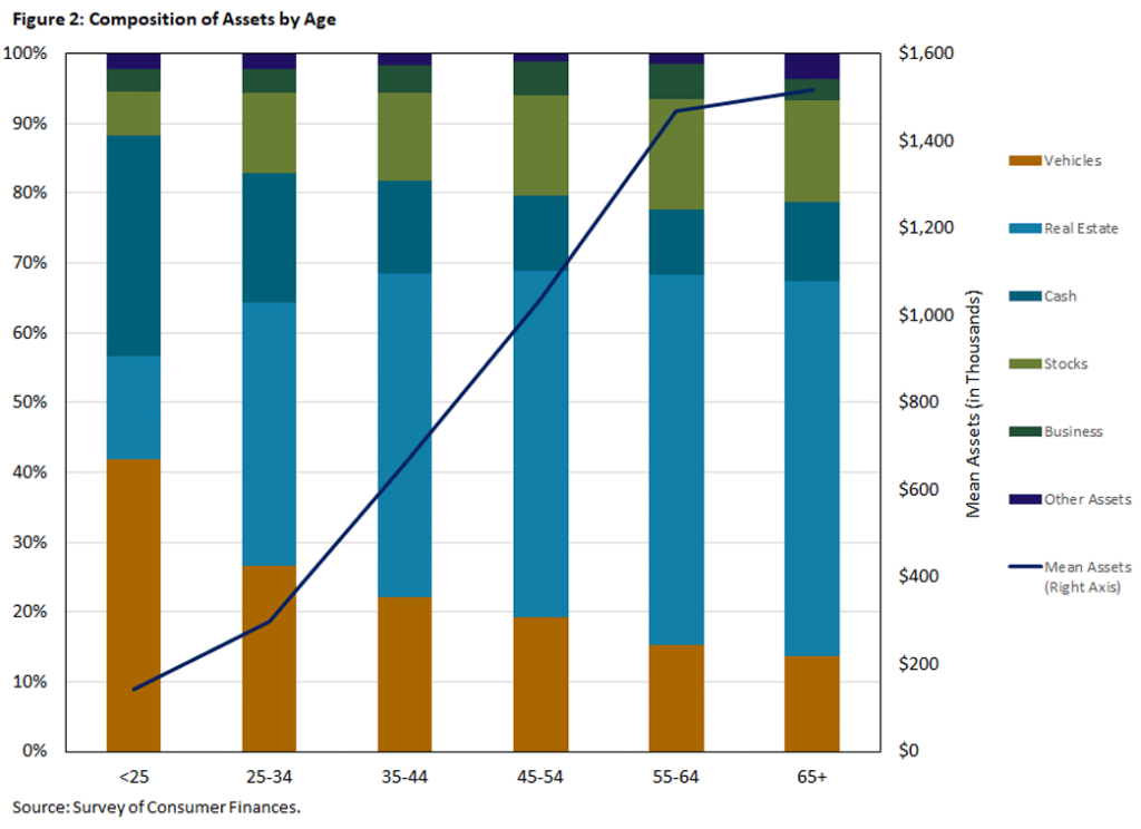 This figure from the Richmond Federal Reserve shows the average (mean?) households’ assets in 2023. Note that the amount of cash+stocks ranges from about 50k at 25-34 to about 400k at 55-64. (Incidentally, I’m puzzled that the value of vehicles for the 55-64 year old crowd appears to be over $200k).